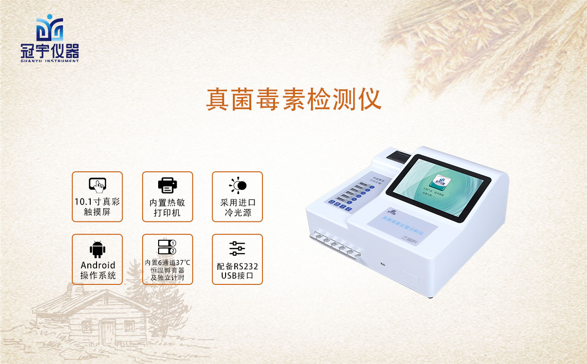 冠宇儀器GY-710真菌毒素殘留定量分析儀應用競爭抑制免疫層析的原理,通過檢測線熒光定量卡中的熒光強弱程度,定量分析待檢樣品中真菌毒素殘留含量。能夠快速定量檢測糧食、飼料、谷物、食用油、調味品等食品中T2毒素、嘔吐毒素、赭曲霉毒素、伏馬毒素、玉米赤霉烯酮,真菌毒素殘留定量分析儀適用于糧油監測中心、糧油飼料生產加工、食品加工貿易、畜禽養殖戶自查、工商質監部門用于市場快速篩查等。